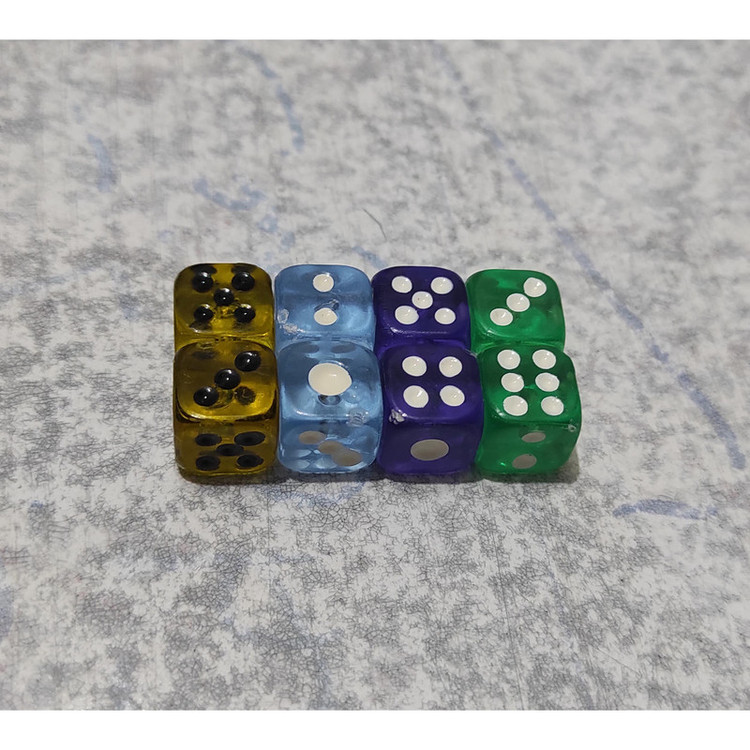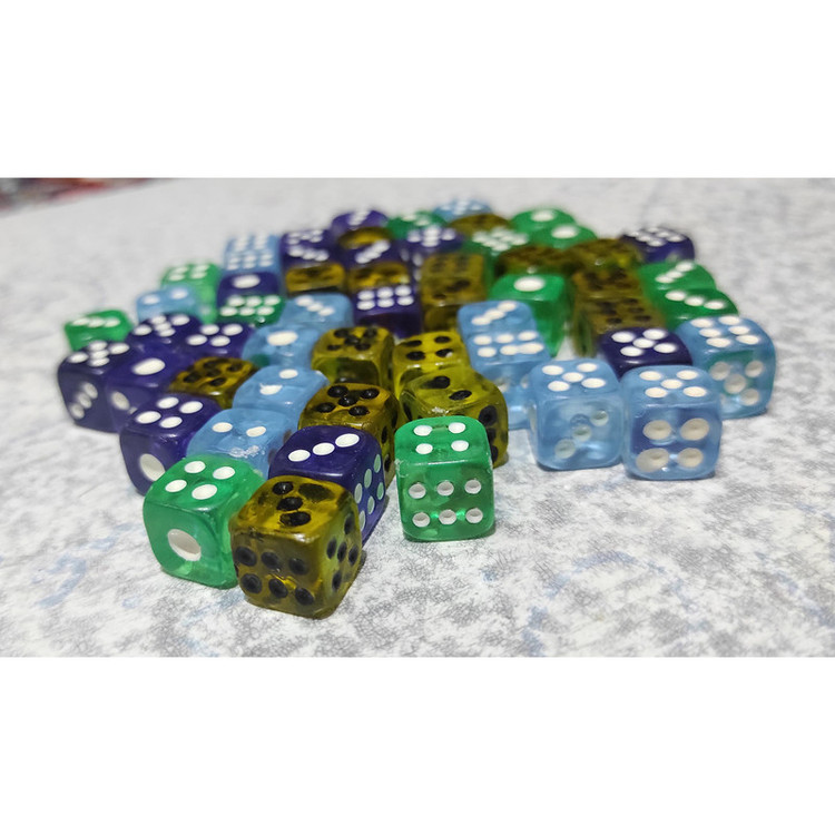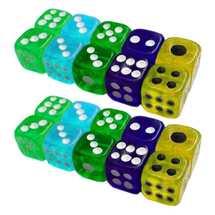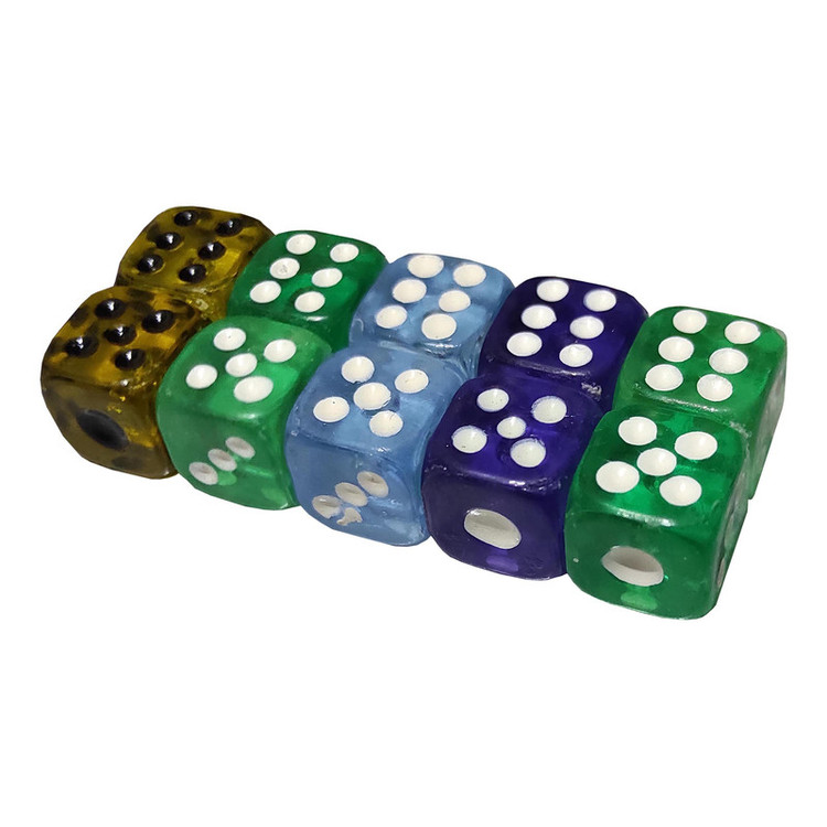 ده جفت ( 20 عدد ) تاس شفاف با ابعاد 10 میلیمتر می باشد. با توجه به رنگهای جذاب و ابعاد کوچک تاسها؛ در حین بازی مراقب بلعیده شدن توسط کودکان ( بویژه کودکان زیر سه سال ) باشید. نکته مهم : رنگ بندی تاس ها متنوع می باشد.