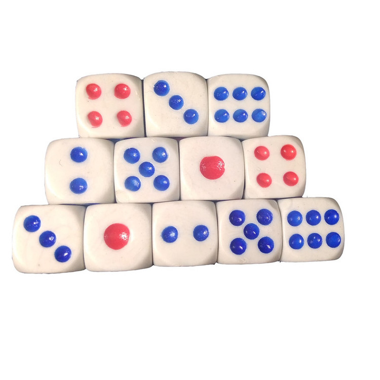 تاس بازی مدل NK1200 مجموعه 12 عددی تاس به ابعاد 11x11x11 میلیمتر ساخته شده از پلاستیک فشرده با رنگ سفید و شماره گذاری شده با خالهای آبی و قرمز می باشد. این تاس از موادی ساخته شده که باعث لغزیدن و چرخش مناسب تاس در هنگام استفاده می شود که مناسب انواع بازی می باشد.